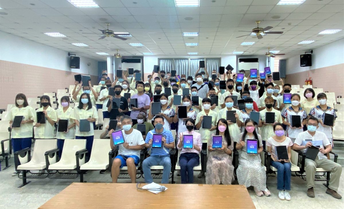 李秋嫺校長(前排左3)和所有一級主管以及全體新生人手一台平板大合影111 年 8 月 17 日星期三更生日報第 6 版花蓮新聞-攀爬岩石、避開藤刺、躲過螞蝗蚊蟲叮咬 光復商工師生馬錫山登頂 宣誓反毒
