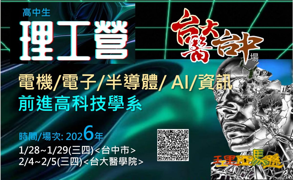 輔導室 輔導室轉知中山醫學大學辦理2026春季-理工科系學系探索營隊Post last modified:2025-11-28Post category:升學專區 / 行政單位公告 / 輔導室公告說明:營隊名稱: 理工營/AI/半導體/資訊日期: 2026年 1月底~2月上旬 (詳見海報)地點: 中山醫學大學/ 或台大醫學院 (詳見海報)報名網址: https://forms.gle/SJQDeT2YsCiefQ9u6 Post Views: 5