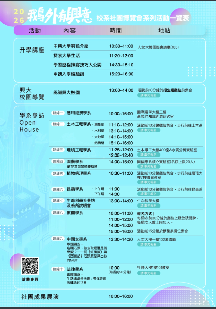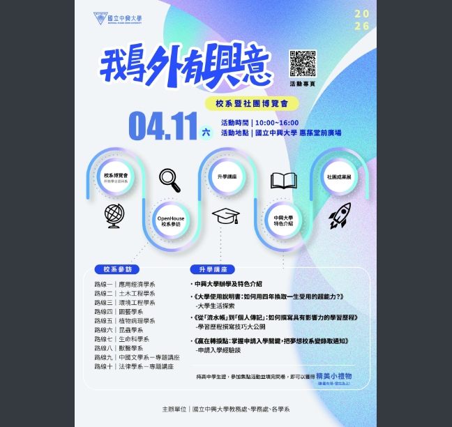 教務處 教學組 國立中興大學訂於115年4月11日(星期六)辦理「2026鵝外有興意-校系暨社團博覽會」活動,鼓勵同學踴躍報名參加Post last modified:2026-03-31Post category:最新消息說明:一、為增進高中學生認識大學校系特色及未來升學進路,協助學生自我探索並激發學習興趣,將於本校惠蓀堂前廣場辦理旨揭活動,敬邀貴校師生共襄盛舉。 二、本次活動內容包含校系博覽會、OpenHouse校系參訪、升學講座、社團博覽會等,詳細資訊可至FB粉專查詢:「興大鵝外有興意-校系暨社團博覽會」。 三、如有任何疑問,請洽本校聯絡窗口:招生暨資訊組蔡佳怡專案助理04-22840216#32。 來文-110下載宣傳海報-1下載活動一覽表下載 Post Views: 7