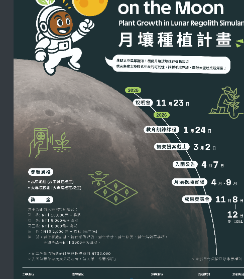 實習處 餐飲科 國家太空中心「Grow Me on the Moon-月壤種植」活動,歡迎有興趣之師生報名參加,報名日期至2026年3月2日止。Post last modified:2025-11-20Post category:最新消息 / 餐飲管理科公告相關資訊如下,請參閱。中興大學月壤種植Kibo-ABC-SSAF-AHiS-2-計畫海報下載中興大學月壤種植活動-Kibo-ABC-SSAF-AHiS-2-計畫簡章下載 Post Views: 5