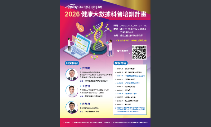教務處 教學組【公告】國家科學及技術委員會生命科學研究發展處(以下簡稱國科會生科處)健康大數據推動計畫辦公室與本校管理學院生技EMBA許怡欣教授團隊等台灣產學研醫健康大數據領域專家共同合作辦理「健康大數據科普培訓計畫」,歡迎 貴校邀請及推薦有興趣之學子們踴躍報名並免費參加科普培訓課程活動Post last modified:2026-01-19Post category:最新消息來文-41下載下載-4下載 Post Views: 4