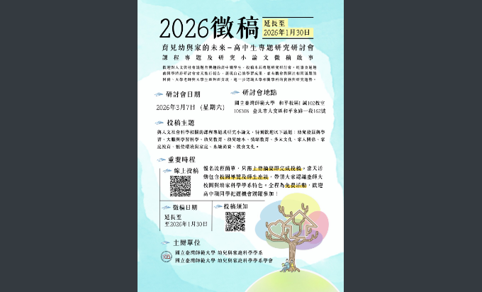 教務處 教學組【公告】國立臺灣師範大學幼兒與家庭科學學系將於115年3月7日舉辦高中生專題研究研討會,徵稿期限延長至115年1月30日,煩請貴校協助宣傳本活動資訊,並鼓勵學生利用課堂專題或研究小論文參加研討會之投稿,我們將會帶給貴校學生一個專業、豐富的學習交流經驗,海報電子檔如附件,請惠允公告Post last modified:2025-12-29Post category:最新消息來文-62下載下載-4下載 Post Views: 6