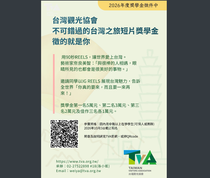 二、為鼓勵學生發掘台灣景點,讓世界旅人看到台灣,本會設立「不可錯過的台灣之旅短片獎學金」。開辦首屆成效良好,超過200件短片作品參賽,參賽者包含本土學子,更有來自緬甸、印尼、越南等地外籍生,以異國視角注入國際元素,證明台灣的美具備跨越國界的力量。本(2026)年度持續辦理,邀請貴校學生用60-90秒IG REELS 短片參賽,展現台灣魅力讓世界愛上台灣。簡章如附件1。