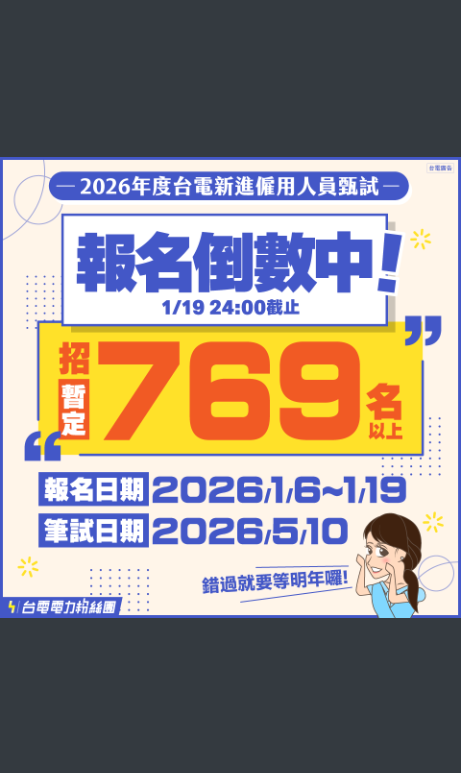 三、錄取人員需經1年養成培育,其中電力技術人員如符合台電相關規定於實際從事現場技術工作或具有電力相關專業證照者,於工作訓練期間起薪可突破4萬元(綜合行政人員起薪約3.7萬元);本甄試一律採網路報名,請於報名期限內至本公司新進僱用人員甄試網站完成報名(網址:https://service.taipower.com.tw/recruit/),歡迎應屆畢業生及有志從事電力事業者踴躍報名。