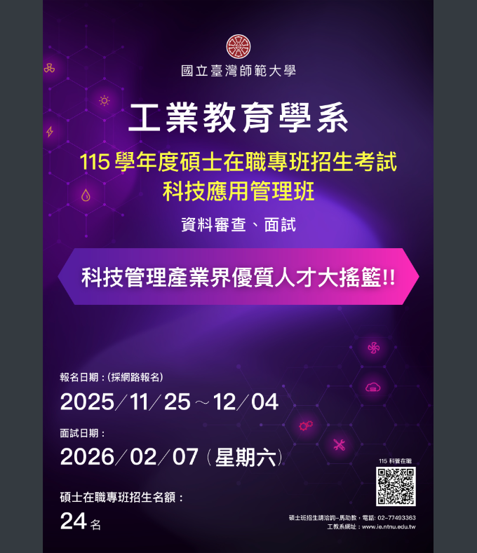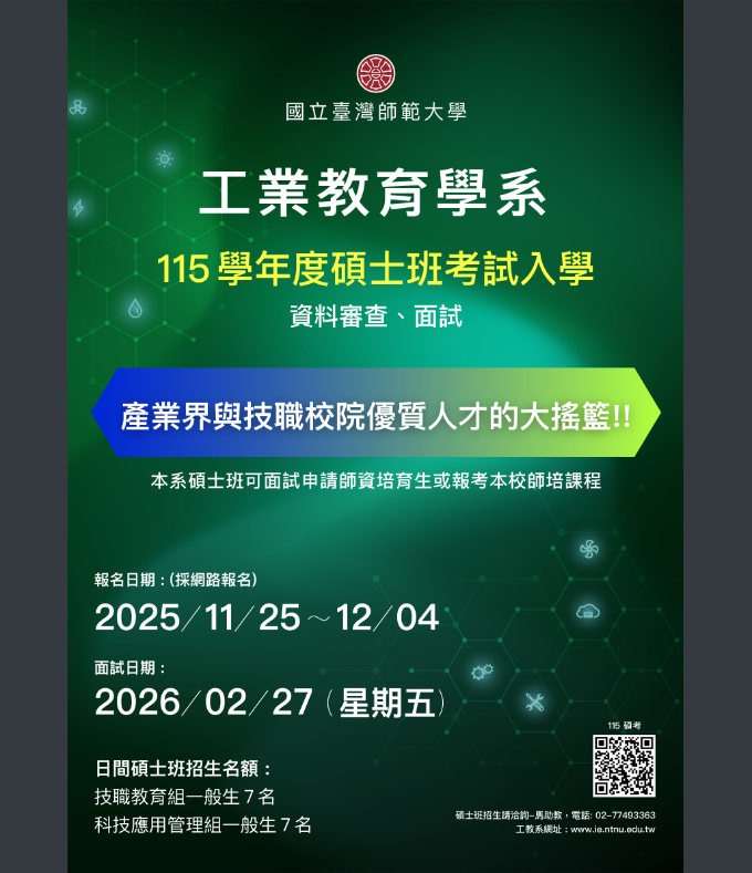 人事室轉知國立臺灣師範大學工業教育學系「115學年度碩士班、碩士在職專班」招生資訊Post last modified:2025-11-21Post category:人事室公告 / 行政單位公告說明:一、網路報名日期:114年11月25日(星期二)上午9時至12月4日(星期四)下午5時止。二、相關招生資訊,請參閱招生宣傳海報(如附件)或至本校招生網頁查詢:(一)碩士班:https://enroll.itc.ntnu.edu.tw//Enroll/MsEntry。(二)碩士在職專班:https://enroll.itc.ntnu.edu.tw/EnrollP/MsPEntry。下載-1-3下載下載-2-1下載 Post Views: 6