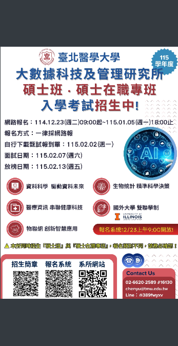 人事室轉知臺北醫學大學大數據科技及管理研究所碩士班/碩士在職專班115學年度入學招生中