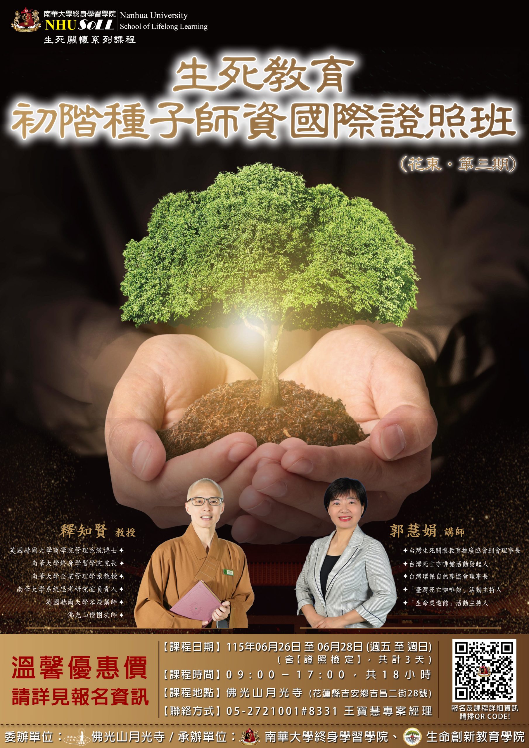 一、課程目的:本課程以生命價值、存在意義、實用生死知識及生死尊嚴為課程規劃架構與內涵,以活潑、多元、創意及突破性的教材及教育方式,讓學員獲得符合現代需求之全方位生死教育理念與知識;未來能進一步將所學帶到社區關懷據點、各級學校、長照家庭等,將正向生命態度與觀念廣為宣導與教育。