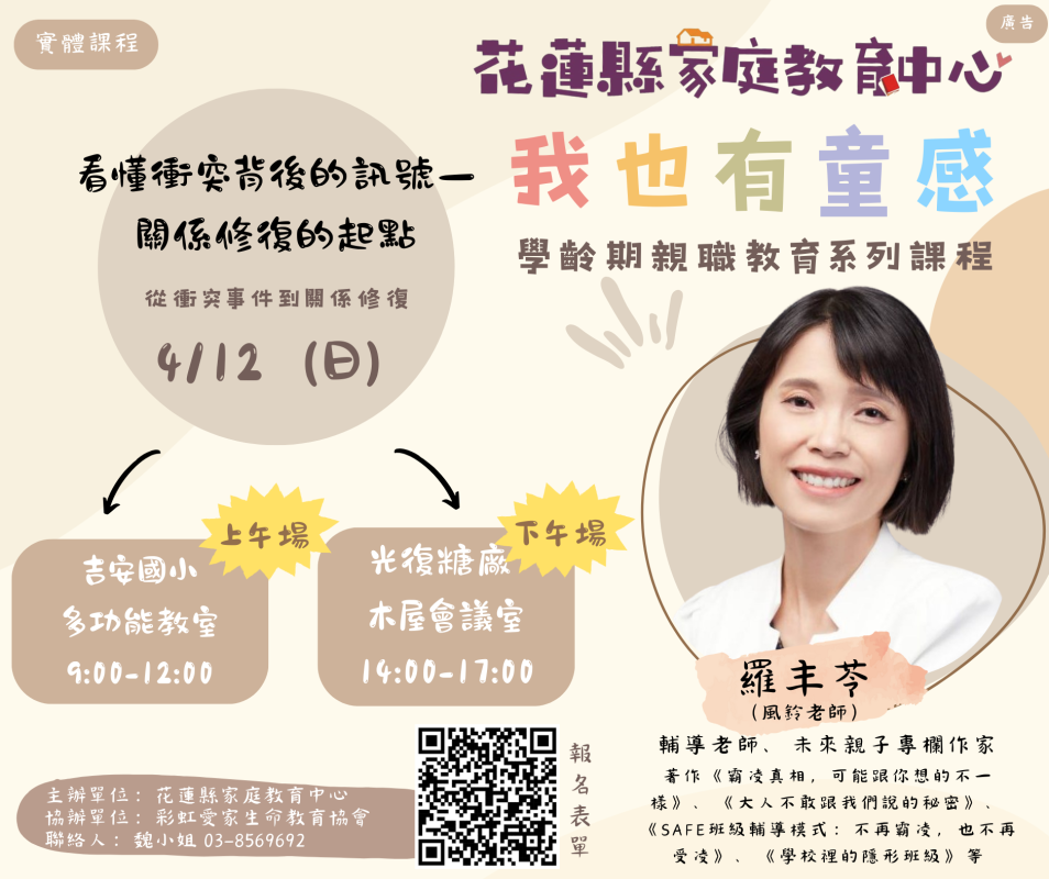 三、本系列課程擬於115年04月12日(日)上午09時至12時假本縣吉安鄉吉安國民小學多功能教室辦理;下午14時至17時假光復糖廠旅館木屋會議室辦理。邀請羅丰苓專任輔導老師擔任主要講師,課程資訊詳如附件(網址路徑:花蓮縣家庭教育中心 /報名專區/親職教育/我也有童感-學齡期親職教育系列課程https://hlc.familyedu.moe.gov.tw/docDetail.aspx?uid=8946&pid=8943&docid=309620),報名連結:https://forms.gle/ZWb54AgDJ2rPp8hC8。