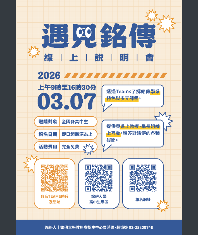 一、讓全國高中生及家長透過Teams了解銘傳大學的學術特色與多元課程。提供與系上專業教授、在校學長姐線上互動的機會,解答高中生及家長對銘傳的各種疑問。將於3/7(週六)辦理「遇見銘傳—線上甄選入學說明會」。