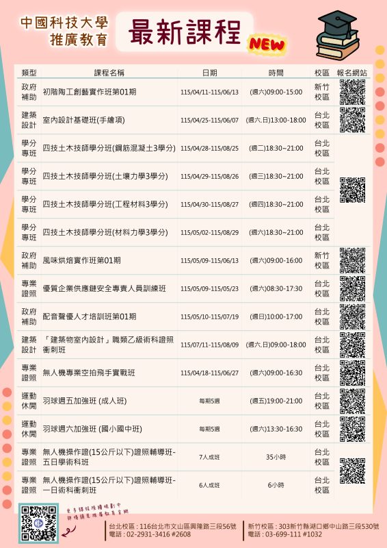 教務處 註冊組中國科技大學推廣教育中心最新課程招生資訊