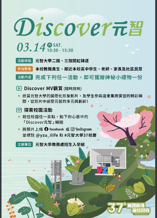 一、本校為慶祝創校37週年,特規劃「Discover 元智」校慶系列活動,透過短片觀賞及校園探索體驗,期協助高中職學生提前認識大學學習環境,作為未來升學規劃之參考,讓參與者深入認識本校國際化辦學特色及多元學習成果。
