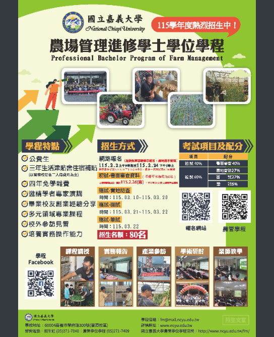 五、洽詢電話:本校農場管理進修學士學位學程05-2717409。