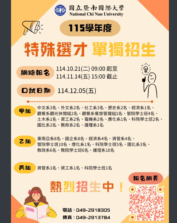 四、招生簡章供免費下載,網址:https://exam.ncnu.edu.tw/。