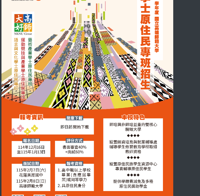 一、本專班招生報名日期自114年12月16日起至115年1月13日止,招生簡章即日起可免費下載。二、詳細招生資訊請參閱本校教務處招生企劃組網頁,日間學制各項招生考試專區https://c.nknu.edu.tw/aca/Default.aspx?GI=4。