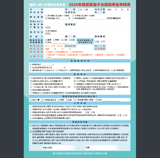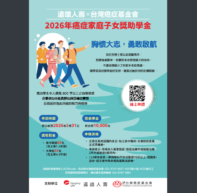教務處 註冊組財團法人臺灣癌症基金會舉辦「2026台灣癌症基金會x遠雄人壽-癌症家庭子女獎助學金」Post last modified:2026-04-27Post category:獎助學金 / 註冊組活動訊息請至台灣癌症基金會官網(網址:www.canceraway.org.tw)查詢;若有任何問題,可致電聯繫:(02)8787-9907#205黃小姐或#230趙社工。 Post Views: 4Tags: 獎助學金, 註冊組Read more articles上一篇文章教務處 註冊組 「BABI寶貝國際急難救助金」