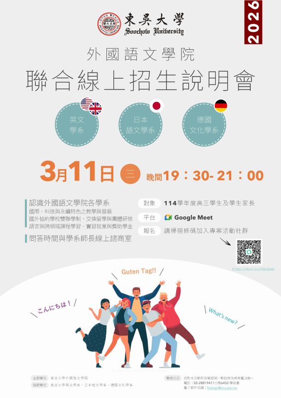 一、本校外國語文學院為幫助高中生及家長深入瞭解所屬各學系之「外語、國際、科技與永續」教學理念和未來規劃,特舉辦聯合線上招生說明會,期協助學生探索學科興趣及掌握多元入學資料之準備方向。