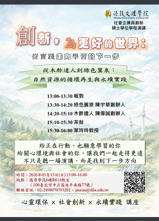 教務處 註冊組法人法鼓文理學院辦理115學年度「社會企業與創新碩士學位學程」招生暨演講活動資訊