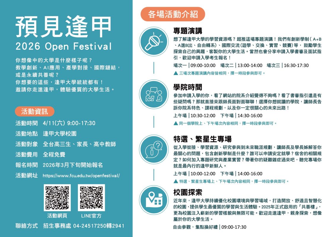 一、本校為提供高中學生、家長及老師認識本校學習資源,特舉辦「預見逢甲2026 Open Festival」,活動內容包含院系特色介紹、場域參觀、申請入學應試重點指引、特選繁星錄取生專場等。