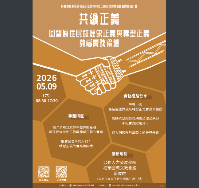 (三)對象:對轉型正義以及原住民族歷史正義與轉型正義議題有興趣之民眾、公務機關人員、現職教師(參與全程之現職教師將核予教師研習時數6小時)。