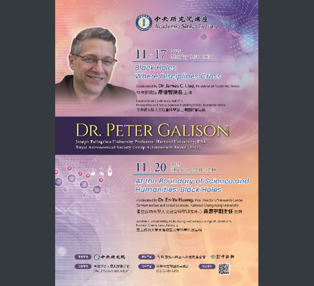「中央研究院講座」第一場於本院舉行,第二場於國立成功大學舉行。第一場演講資訊如下:(一)時間:本年11月17日 (星期一)14時30分至16時30分(二)地點:中央研究院人文社會科學館三樓國際會議廳(三)講題:Black Holes: Where Disciplines Cross (黑洞:跨越學科的交會點)