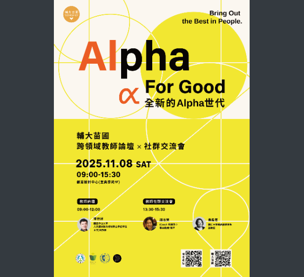 教務處 教學組 輔仁大學學校財團法人輔仁大學舉辦教育部跨領域教師發展暨人才培育計畫輔大苗圃【Alpha For Good:全新的Alpha世代】跨領域教師論壇&社群交流會Post last modified:2025-10-28Post category:教務處公告 / 教學組 / 最新消息 / 行政單位公告 Post Views: 9