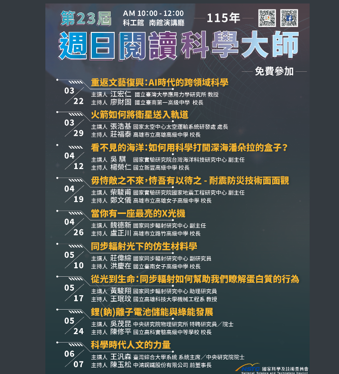 二、115年3月至6月份講座場次表及海報,如附件,演講地點於國立科學工藝博物館南館演講廳,每場講座亦核發參加教師2小時研習時數,以及參加公務人員核予2小時進修時數,本講座亦提供現場直播,歡迎透過週日閱讀科學大師官網http://science.nchc.org.tw/web即時收播。